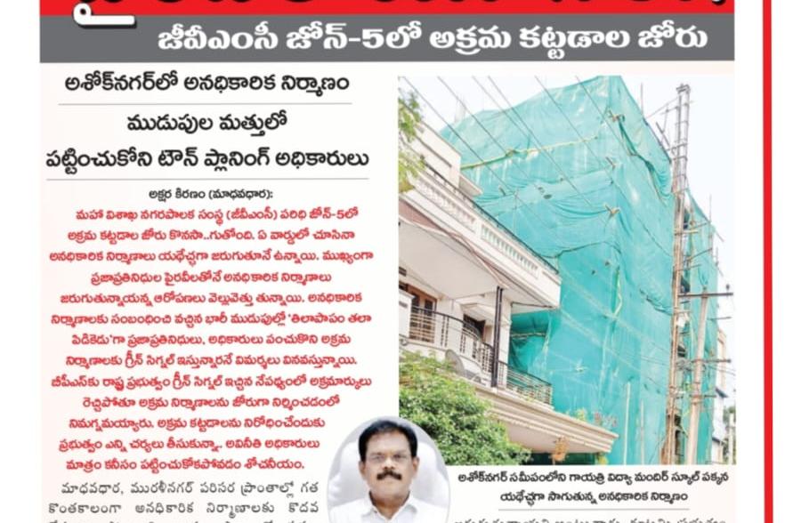 జీవీఎంసీ జోన్ ఫైవ్ మాధవధార పరిధిలో జరుగుతున్న అక్రమ కట్టడాలపై జీవీ ఎంసీ టౌన్ ప్లానింగ్ అధికారులు ఎట్టకేలకు స్పందిం చారు. కొంతకాలంగా జోన్ 5 మాధవధార మురళినగర్ కంచరపాలెం పరిసర ప్రాంతాల్లో భారీ ఎత్తున అనధికారిక నిర్మాణాల జోరు కొనసాగుతోంది.