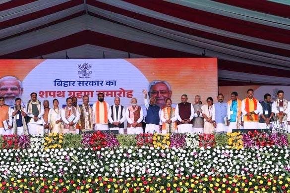 అక్షర కిరణం, (పట్నా/జాతీయం): బిహార్ అసెంబ్లీ ఎన్నికల్లో బీజేపీ నేతృత్వంలోని నేషనల్ డెమోక్రటిక్ అలయన్స్ (ఎన్డీఏ) కూటమి 202 స్థానాలను కైవసం చేసు కుని అద్భుత విజయం సాధించిన తర్వాత కొత్త ప్రభుత్వాన్ని ఏర్పాటు చేసింది. రికార్డు స్థాయిలో నితీష్ కుమార్ పదోసారి ముఖ్యమంత్రిగా ప్రమాణ స్వీకారం చేశారు. రాజ ధాని పాట్నాలోని చారిత్రక గాంధీ మైదాన్లో గురువారం ఈ కార్యక్రమం అట్టహాసంగా జరిగింది. బిహార్ మంత్రివర్గ ప్రమాణ స్వీకారోత్సవం దేశంలో ఎన్డీఏ బలాన్ని చాటి చెప్పింది. నితీష్ కుమార్ ప్రమాణ స్వీకారోత్సవానికి ప్రధాన మంత్రి నరేంద్ర మోదీ సహా కేంద్ర మంత్రులు అమిత్ షా, రాజ్నాథ్సింగ్, జేపీ నడ్డా హాజరయ్యారు. ఆంధ్రప్రదేశ్ ముఖ్యమంత్రి చంద్రబాబు నాయుడు సహా ఎన్డీఏ పాలిత రాష్ట్రాల సీఎంలు పాల్గొన్నారు.